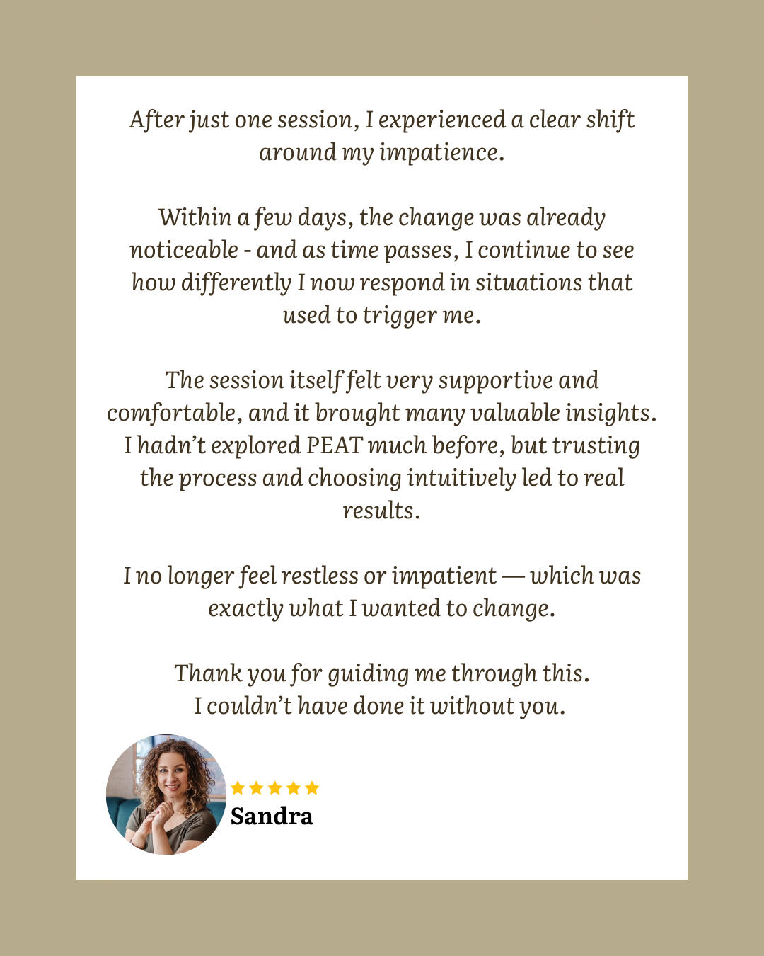 You become more aware of your true nature - and you start living in alignment with it.During our work, you also receive practical tools and self-regulation practices that you can use independently - during and after the program.