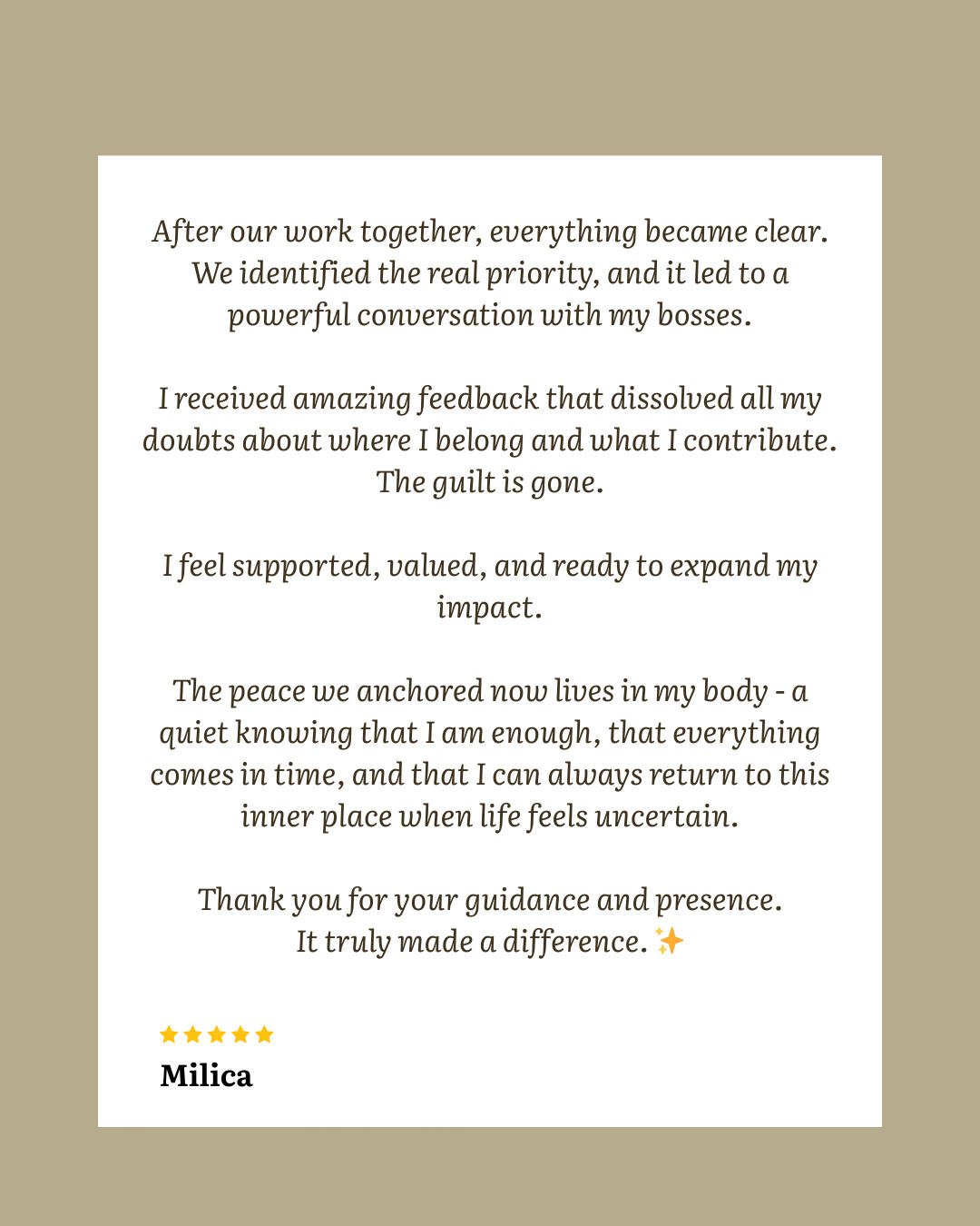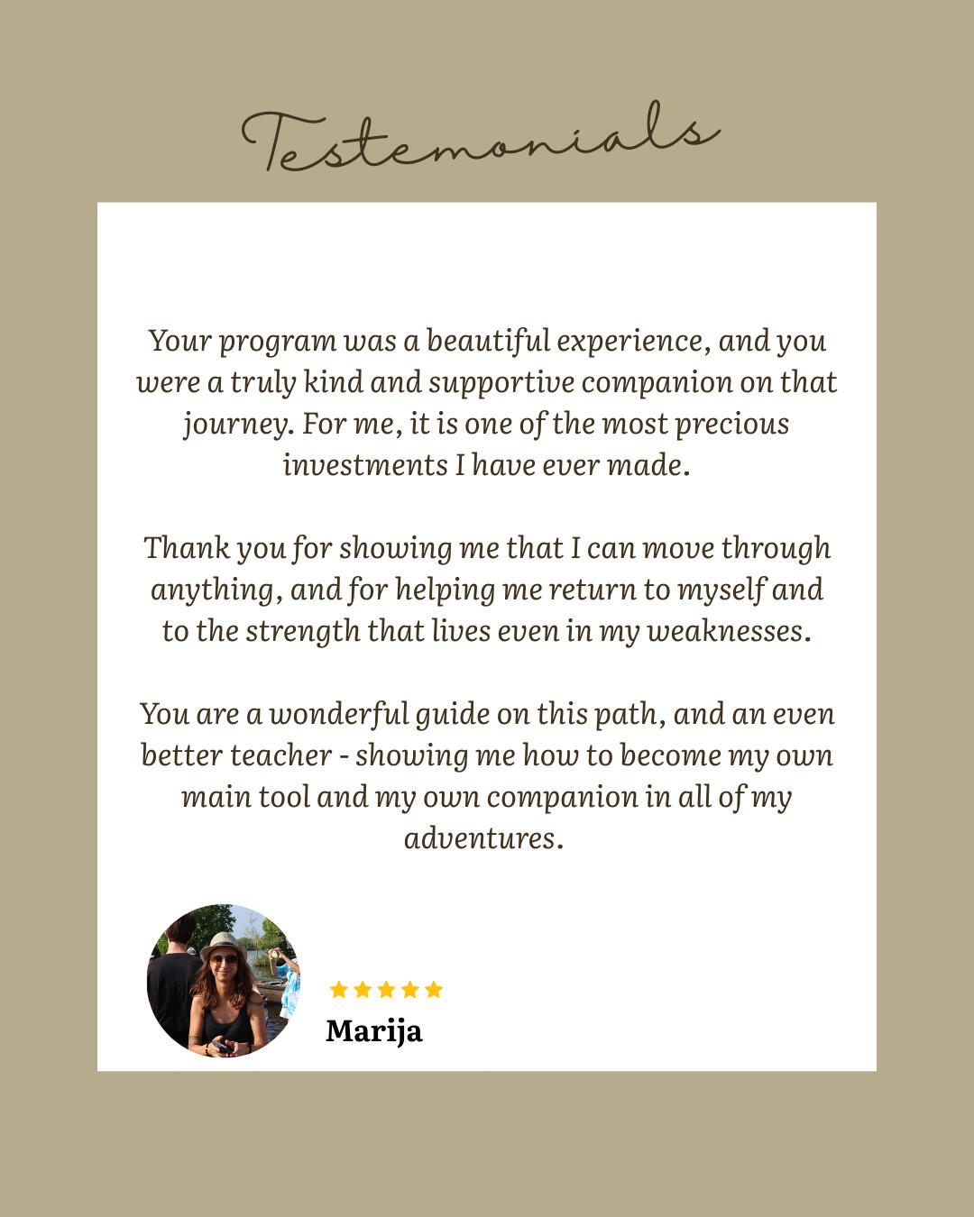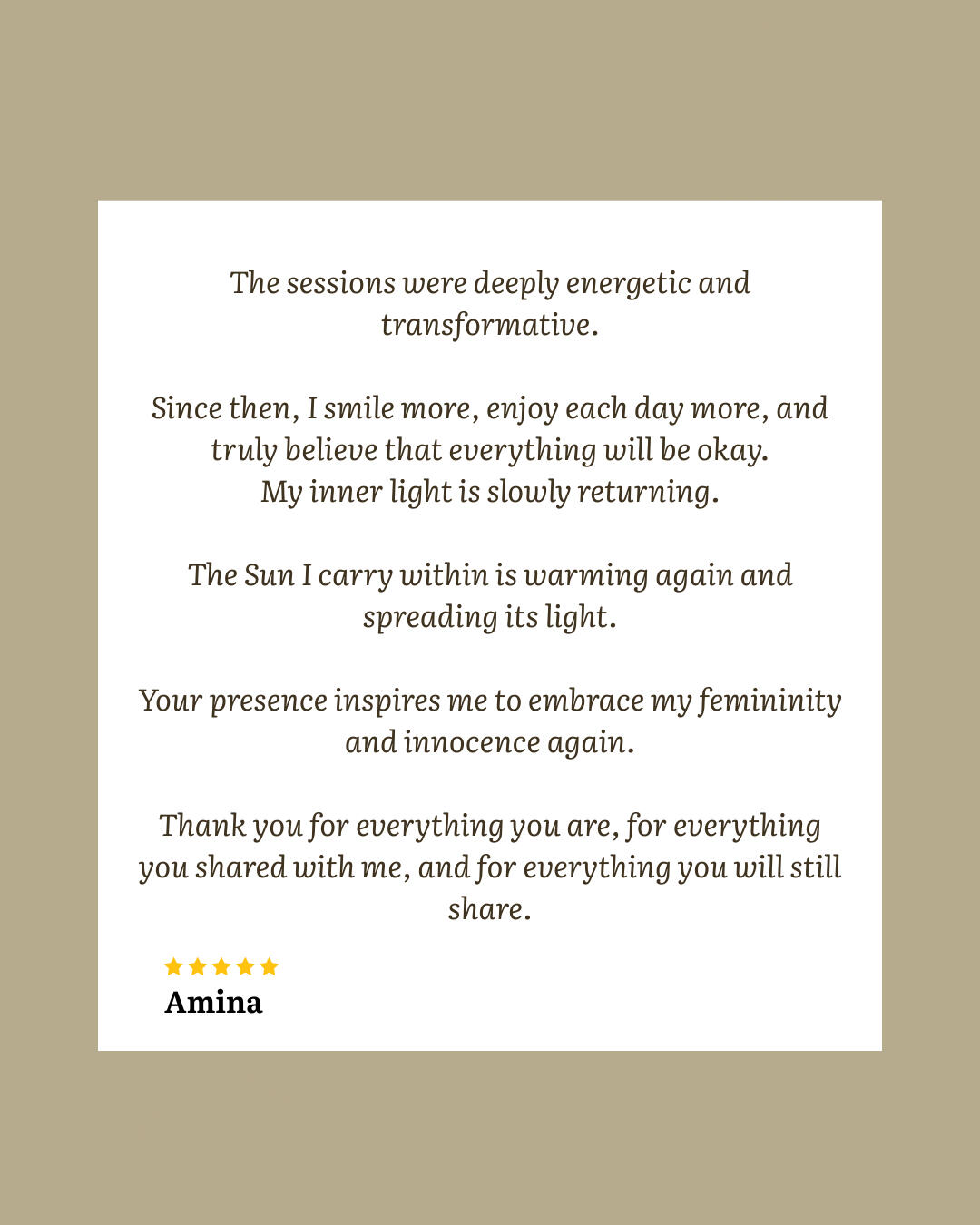 Maybe you no longer feel clear about what you want. Maybe you feel disconnected from your body. And yet, deep inside, you sense there is more - that life is not meant to be just a list of obligations and “shoulds.”After ten years of my own search for truth and meaning - through learning, inner work, and transformation - I created a space where I support women in remembering who they are.A space rooted in truth, empathy, support, freedom, and play.